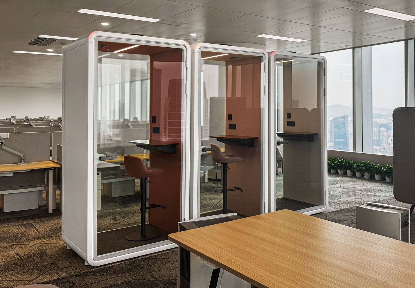 —— A single pod in the open office area, equipped with a busy indicator light, operates more efficiently